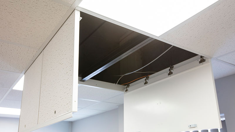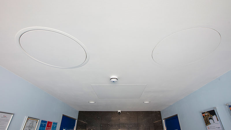 Concealed, discreet ceiling access panel with a high acoustic shielding as standard, typically with a push catch lock to enhance the aesthetic design.